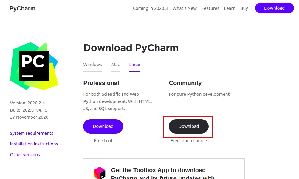 まずは、登竜門となるHello某を実行することができました。しかし、実際のプログラムをコンソールで書く人は、プロの現場ではまずいませんw そこで登場するのがIDE(統合開発環境)ですね。当サイトでは「PyCharm」というツールをご紹介します。ダウンロードはこちらのサイトから行います。https://www.jetbrains.com/pycharm/download/#section=linux