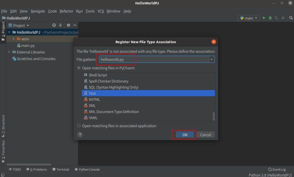 作成したプロジェクト名のフォルダ部分で右クリック->New->Python Fileと順番に進めて行き、”Helloworld.py”と入力してOKボタンを押下してください。Pythonの拡張子は”xxx.py”ですので、拡張子までしっかり入力するようにしてください。