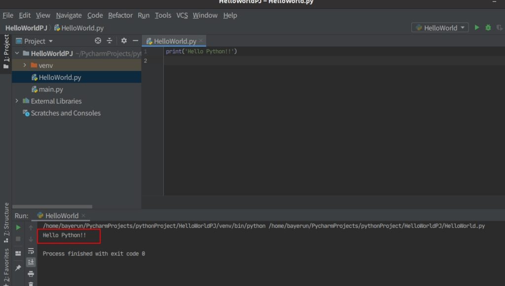 これで”Hello World!”を出力することができました。PyCharmはソースコードの補完機能もあり研究機関でも利用されいているとても優れたツールです。他にもVisualStudioCodeやAtom、JupyterNotebookといったPythonの開発に利用されているエディタもありますので、ご自身でいろいろ試してみることをオススメします。きっとあなたにあったPython開発環境が見つかるハズ。ではまた。