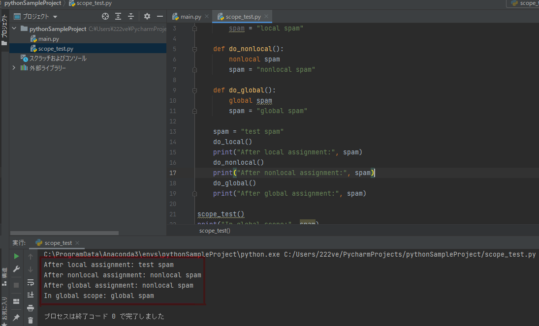 print("In global scope:", spam)上記のソースはPython3のマニュアル「9.2.1. スコープと名前空間の例」のサンプルプログラムです。異なるスコープと名前空間がどのように参照されるか、また global および nonlocal が変数の束縛にどう影響するかの例です。実行結果は以下の通りです。「global」で宣言された変数は関数呼び出し後も変更後の情報が保持されます。